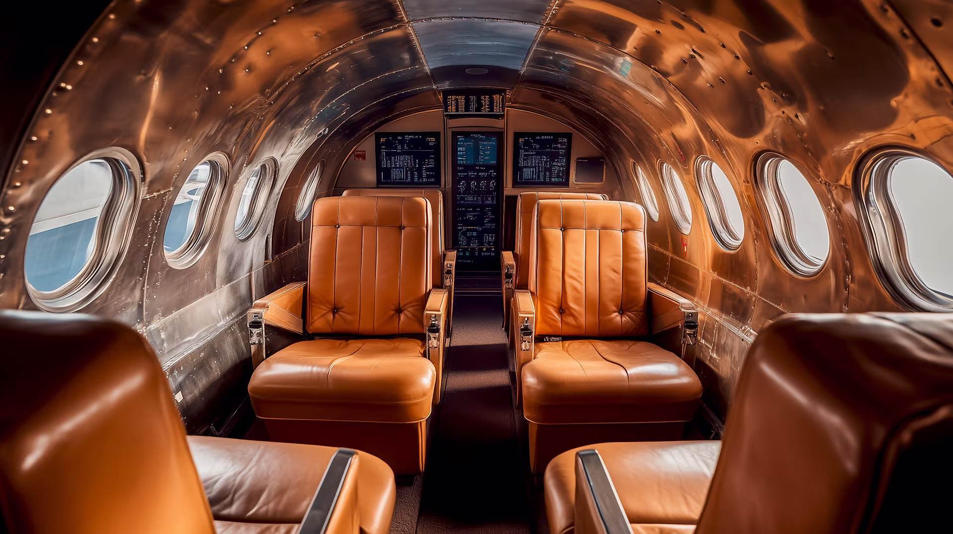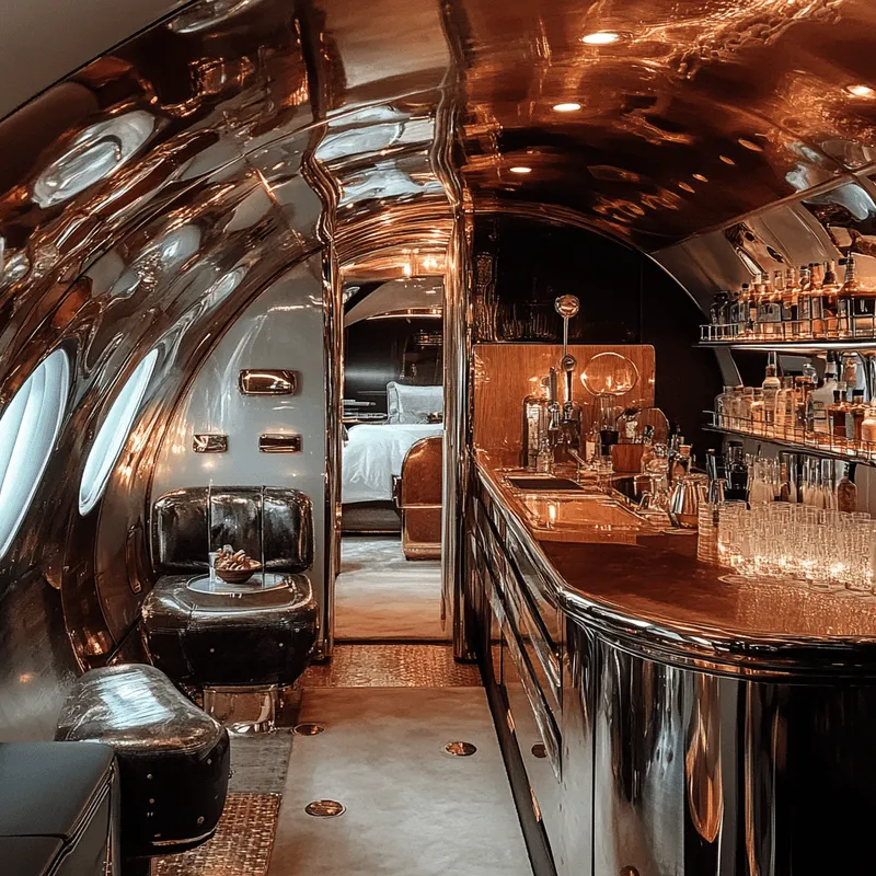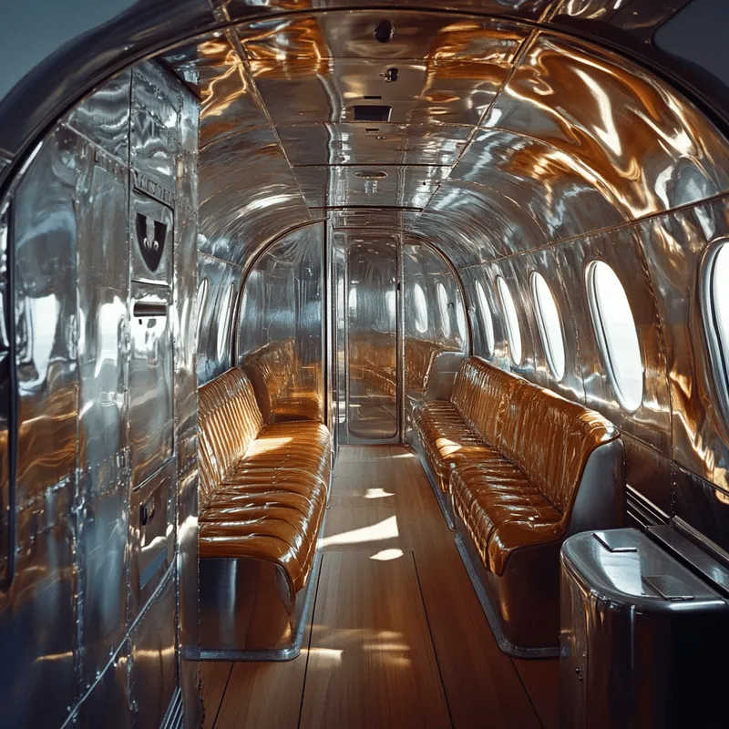 Inspired by the classic designs of early aviation, this cabin features rich leather seats and a polished metal interior, providing both comfort and a sense of nostalgia. The warm tones and retro finishes create a timeless travel experience, blending vintage aesthetics with modern conveniences.