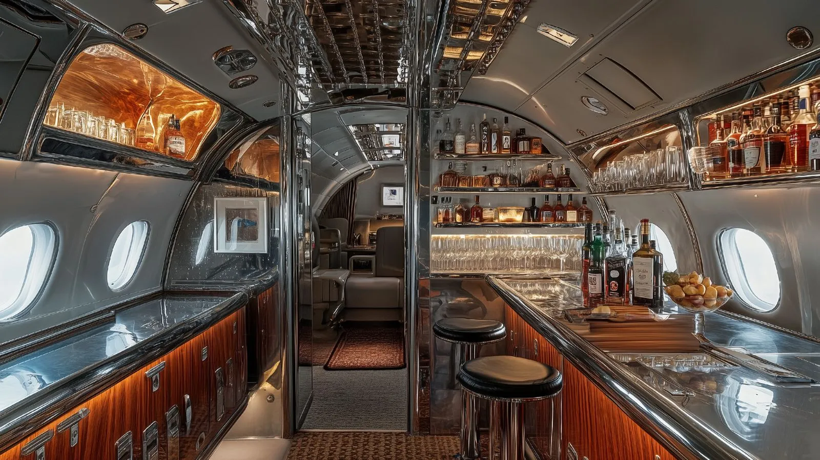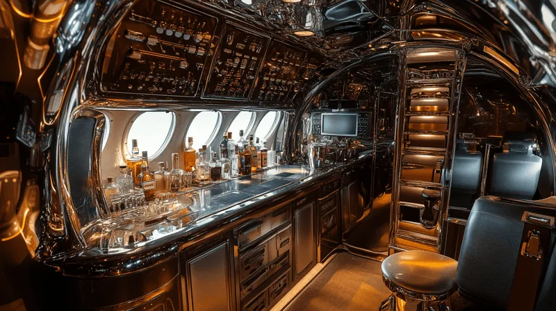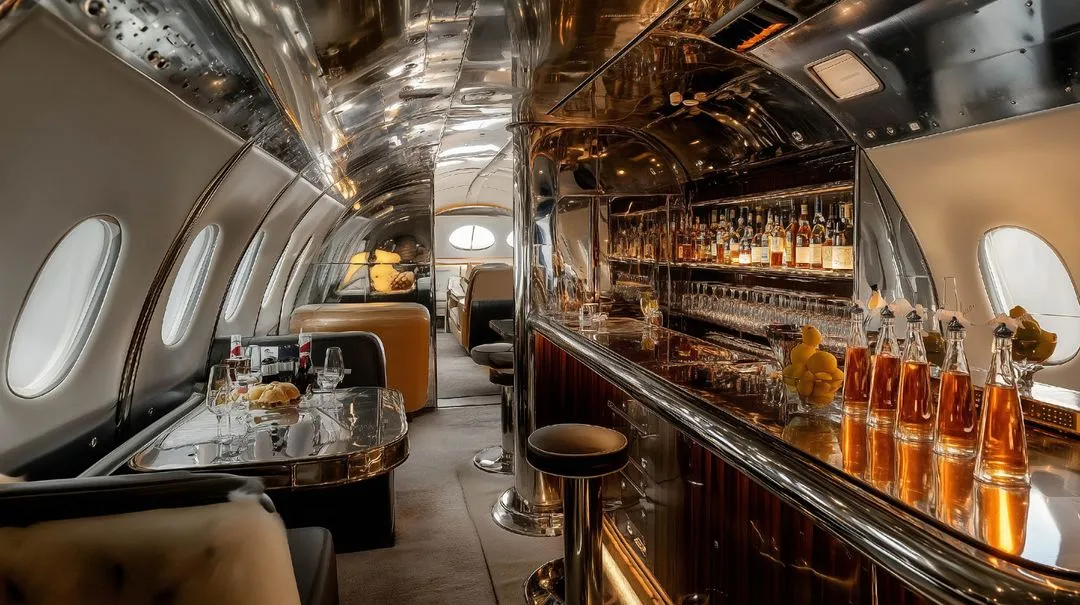 Step into a sophisticated in-flight bar, reminiscent of aviation's golden age. The sleek design features high-end materials and meticulous craftsmanship, offering passengers a lavish atmosphere to enjoy fine dining, top-shelf drinks, and comfortable socialization during their journey.